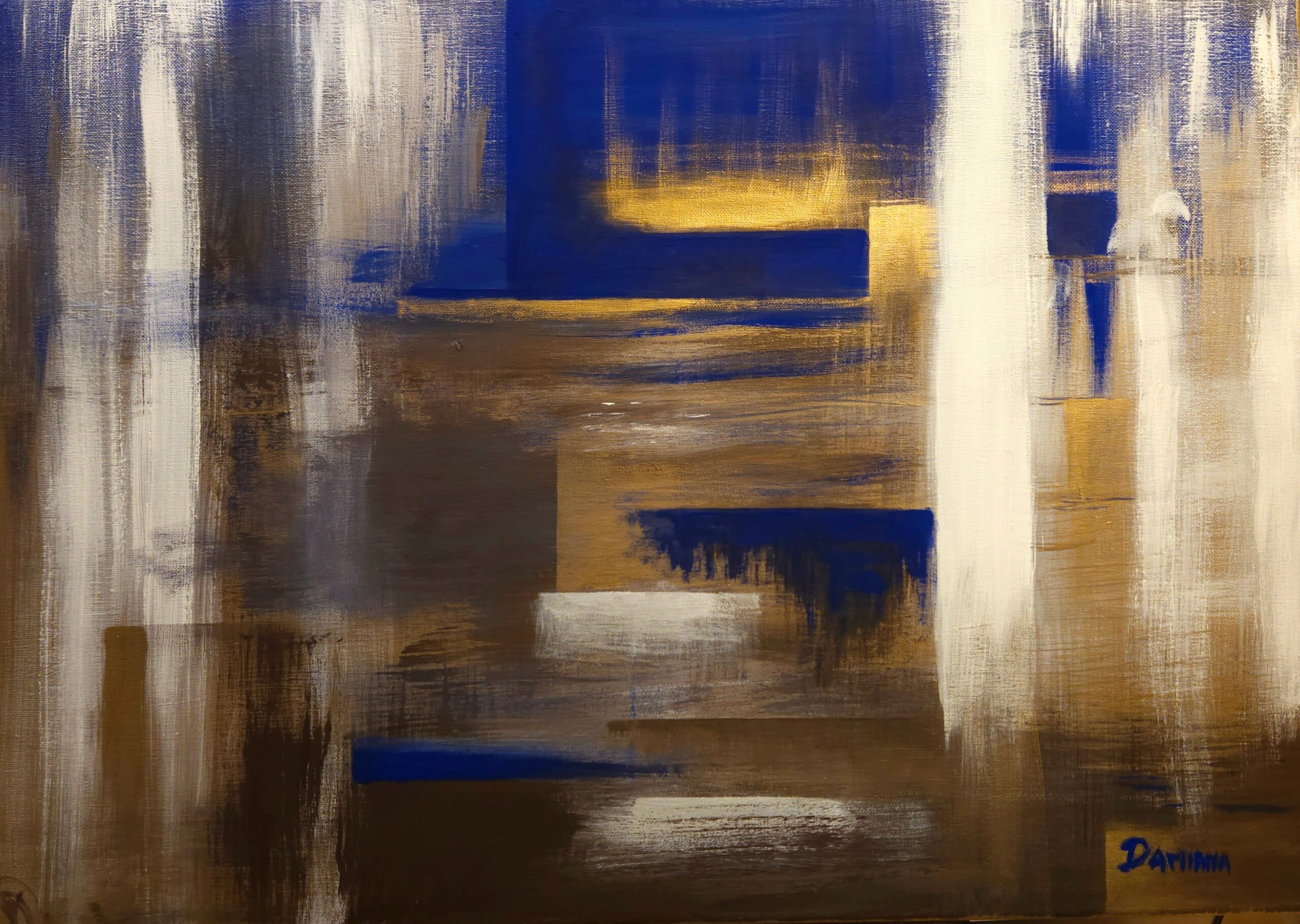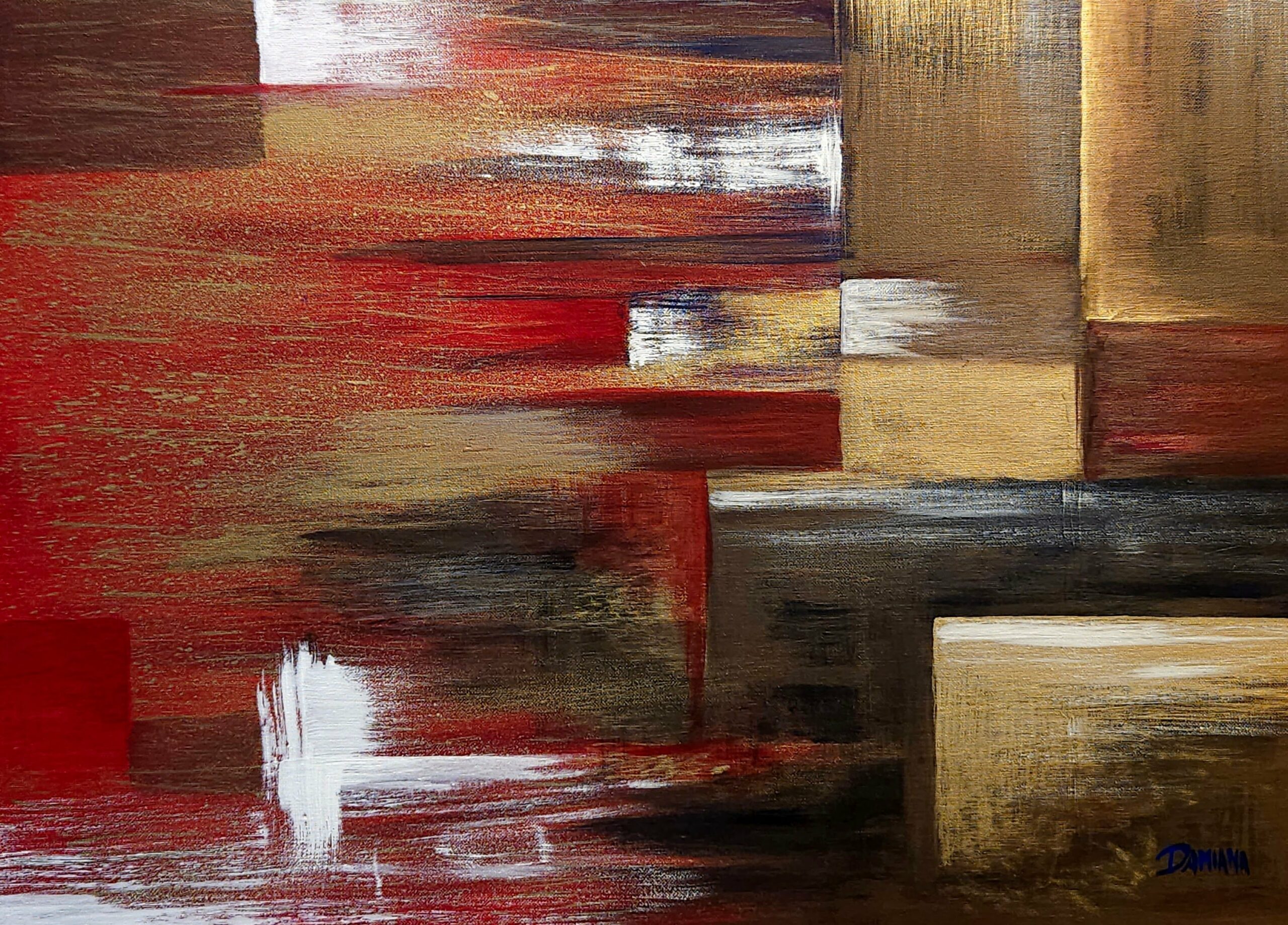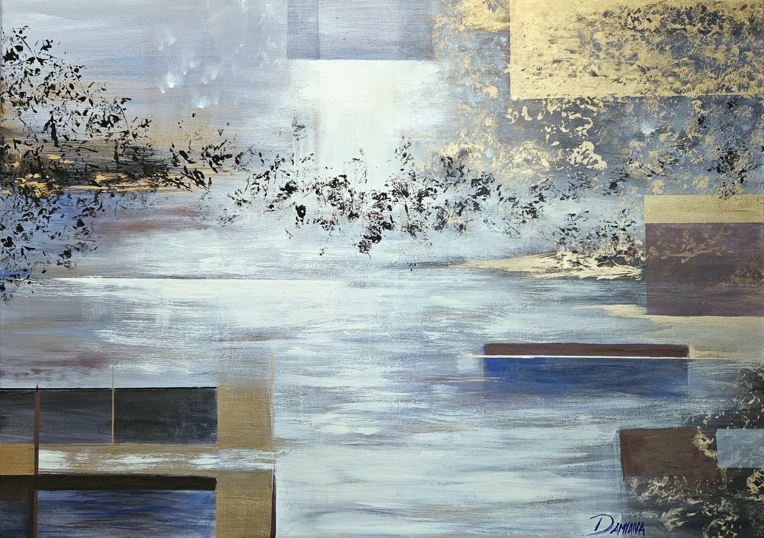 In “Burning Matter” il flusso diventa la forza primordiale di terra e fuoco, resa attraverso spatolate materiche e la brillantezza della polvere di mica, simbolo di energia e trasformazione.