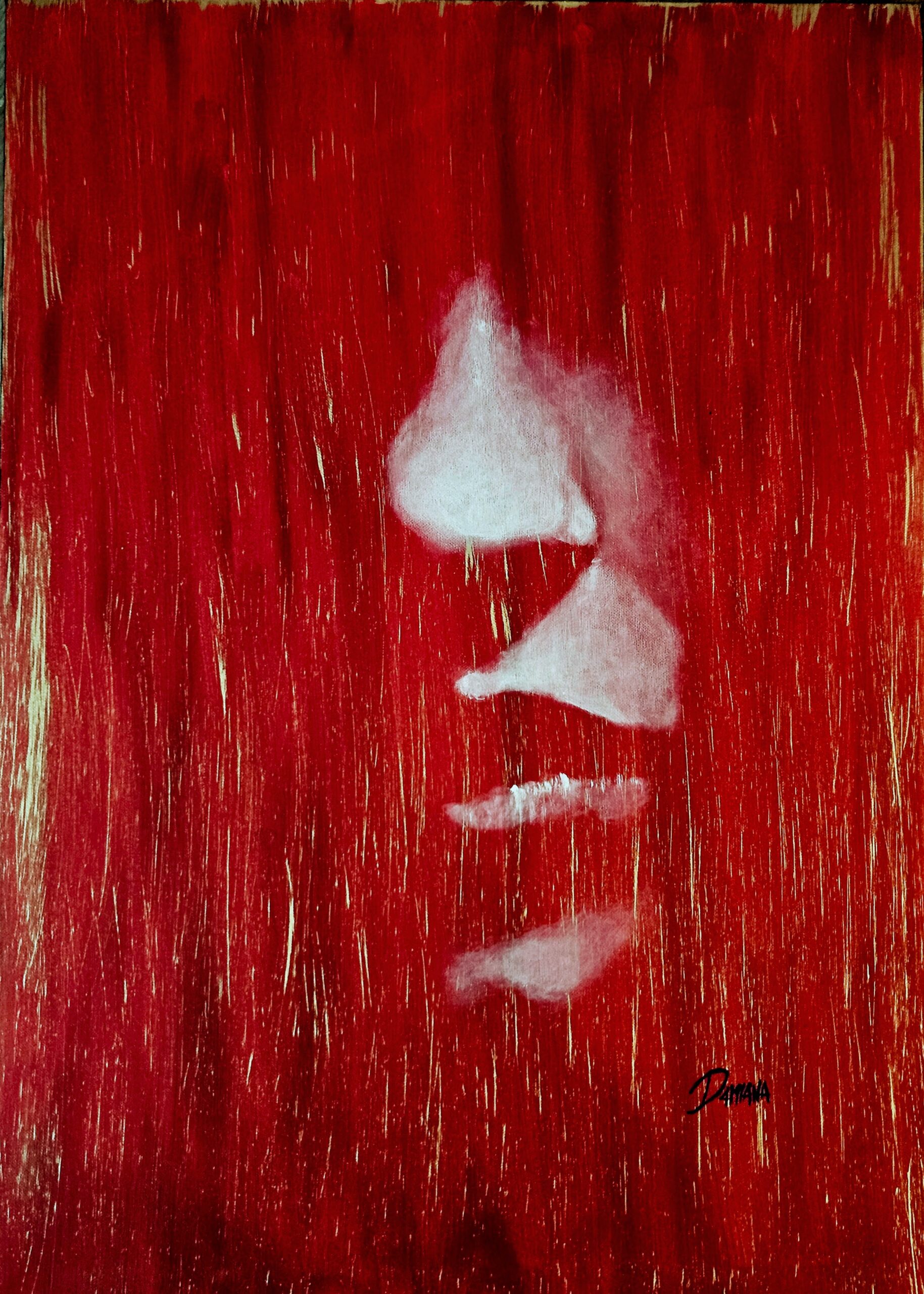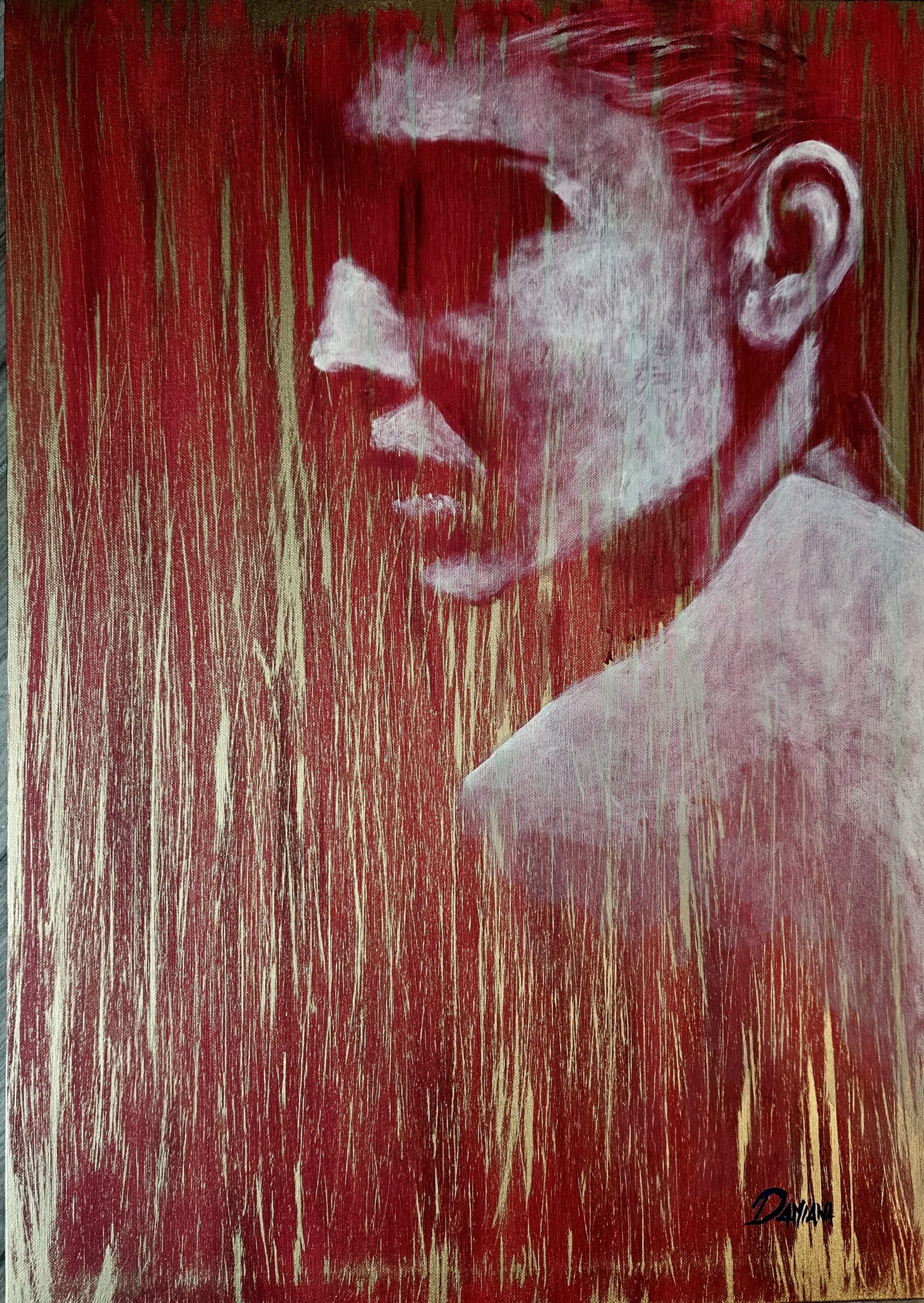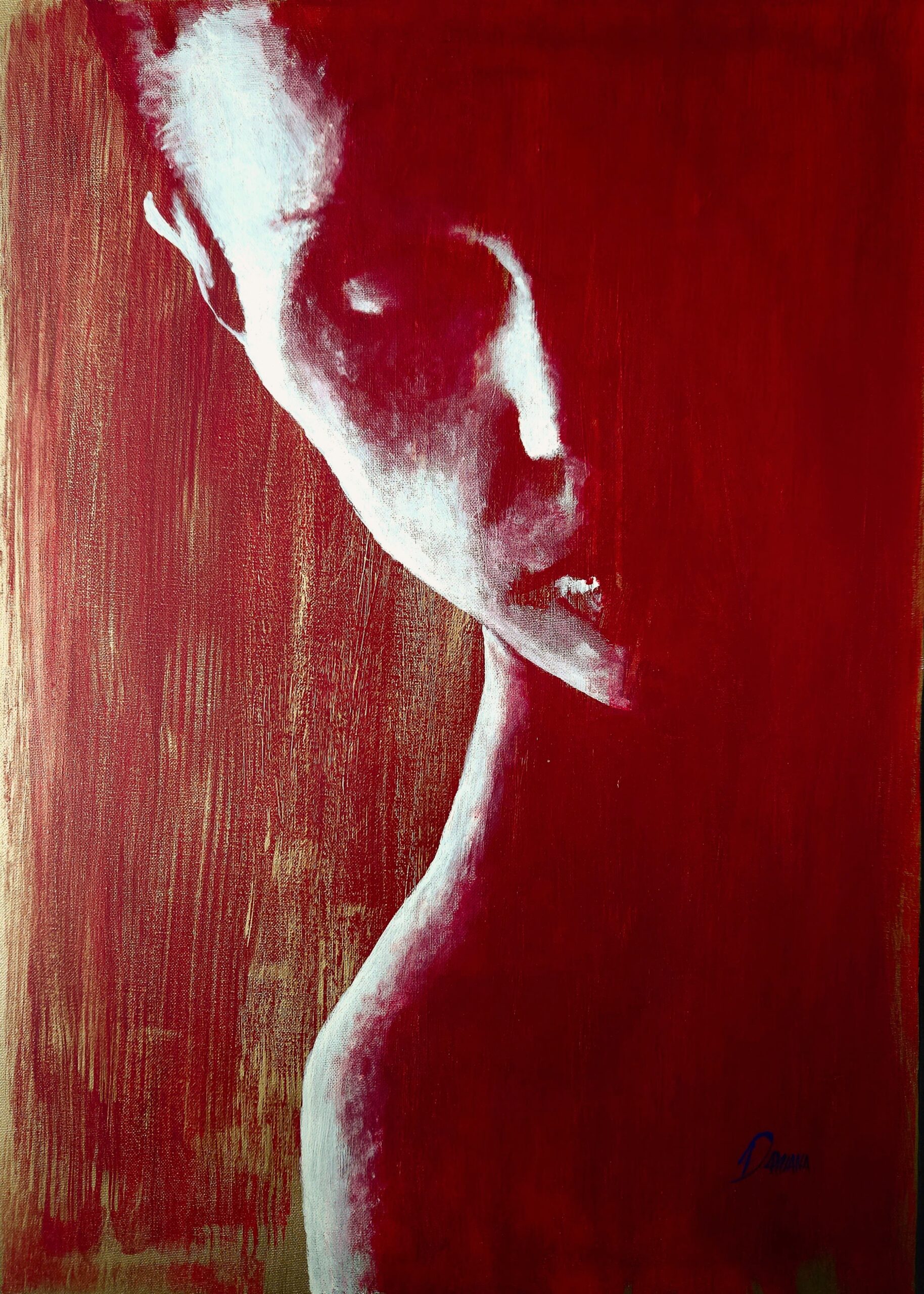 Serie di sei opere, dedicata al viaggio dell’anima alla ricerca dell’Oltre. L’attenzione viene posta completamente sul chiaroscuro, intreccio della luce e dell’ombra. La luce viene rappresentata attraverso l’acrilico dorato, con la sua gamma di riflessi cangianti che donano all’opera movimento e carattere. L’ombra viene resa utilizzando il rosso puro con la sua forza dirompente. Per definire i volumi ho scelto un bianco caldo che dona equilibrio. L’anima viene rappresentata archetipicamente dal femminile, le pose riflettono il suo legame con il trascendente.