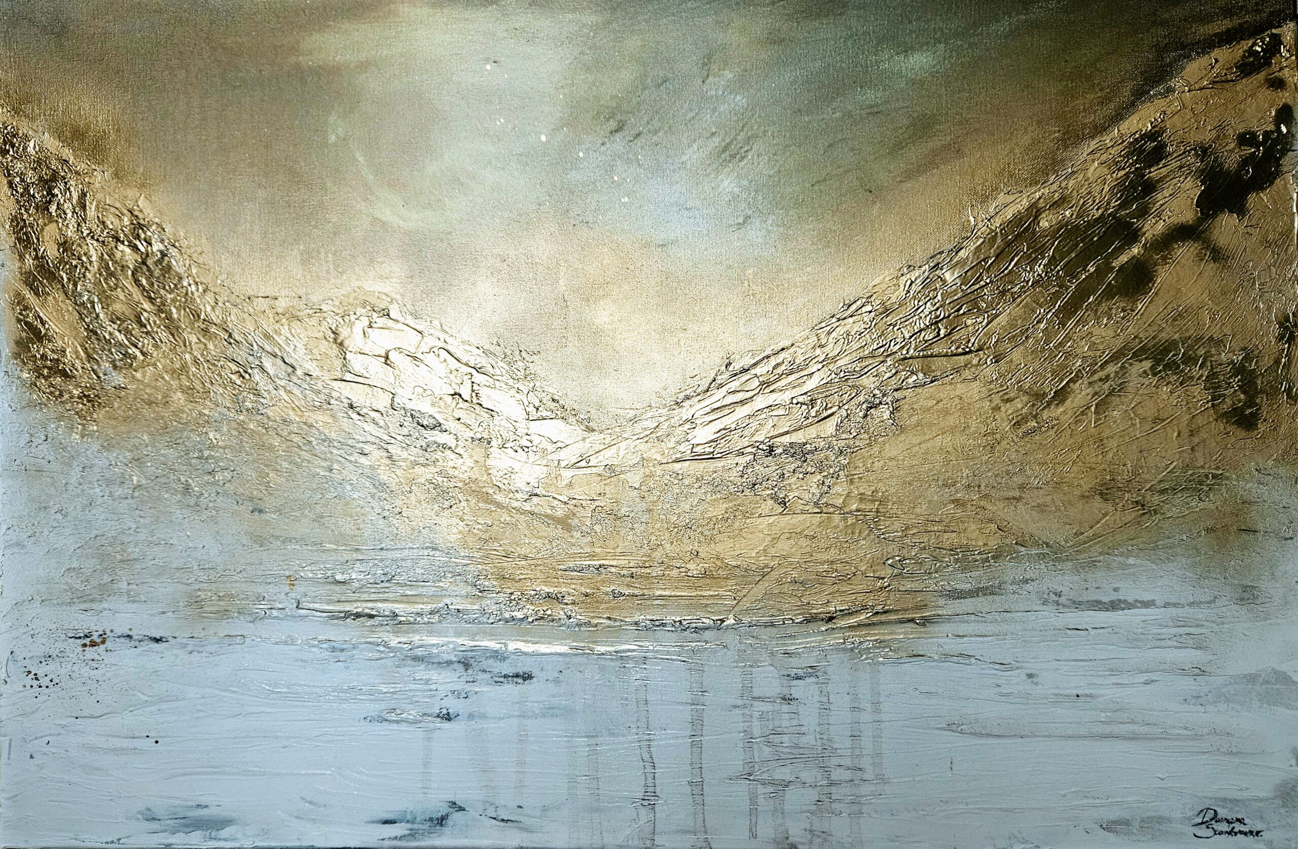 Protagonista è la luce, che si riflette sul bianco azzurrato della neve, sulle cime dorate dei monti, negli spazi immensi dai colori cangianti del cielo invernale. La polvere di mica si stende a creare sensazioni, più che impressioni nette, come la trama sottile di un sogno che cambia il proprio stato all’improvviso. La matericità delle montagne è resa con spatolate di gesso che forniscono una base materica e tattile in grado di creare, con chiaroscuri lucidi e opachi, gli anfratti nei quali una polvere brillante e iridescente si adagia.