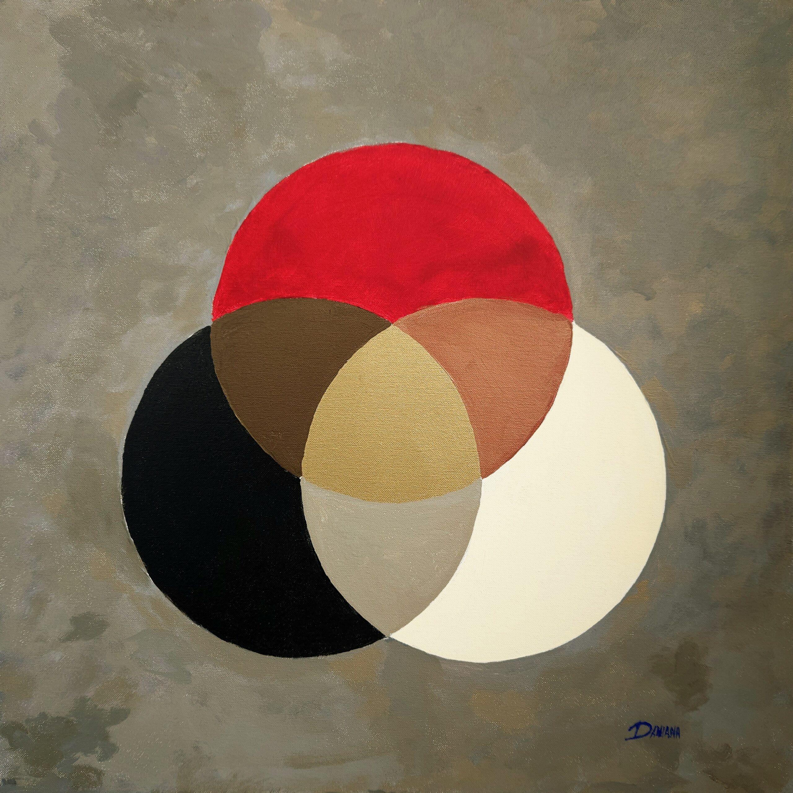 Sullo sfondo una texture composta dai tre colori in forma embrionale: il terreno ancora senza coscienza, ma fertile, dal quale la figura prende vita. L'energia indistinta che al centro assume la forma un triangolo di Reuleaux dorato: emblema della sintesi e dell'unità ritrovata, un nucleo di quiete che custodisce l'essenza indivisa e la promessa della trasformazione compiuta.