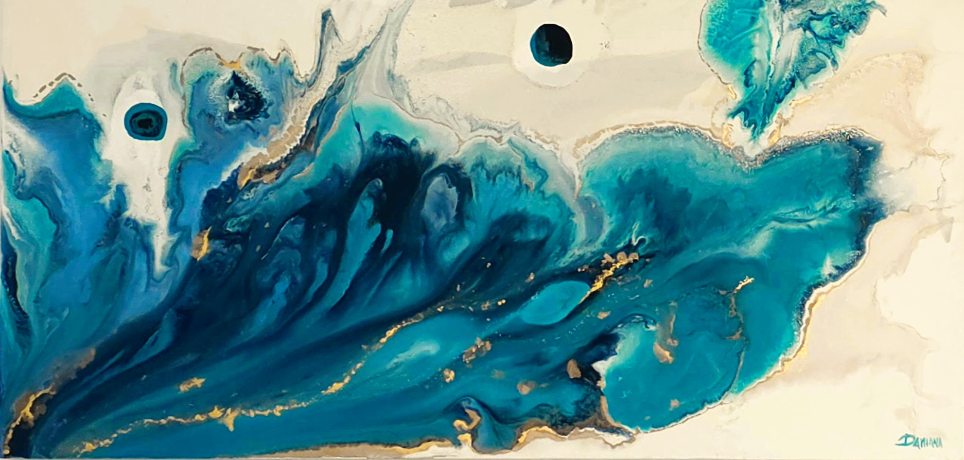 In "Fluid Breath" il movimento creativo plasma con leggerezza acqua e aria, restituendo la sensazione di mutevolezza del movimento vitale. Realizzato con la tecnica della fluid art, nella quale il colore si fa liquido e il movimento crea la forma.
