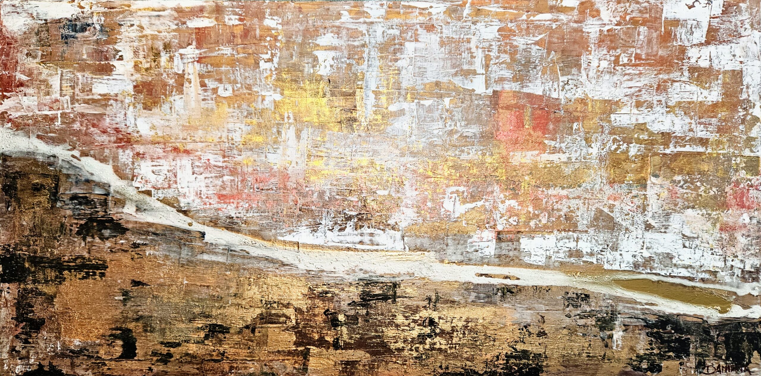 L'opera si presenta come una composizione di forte impatto materico e cromatico, giocata sull’equilibrio tra struttura e dissolvenza. La tessitura pittorica è attraversata da tagli di luce orizzontali che incidono la superficie come fenditure luminose, suggerendo il riflesso obliquo del sole al tramonto sull'acqua o sulla sabbia. Questi interventi bianchi e avorio non solo guidano lo sguardo, ma attivano un ritmo visivo interno che anima la staticità apparente dei volumi.