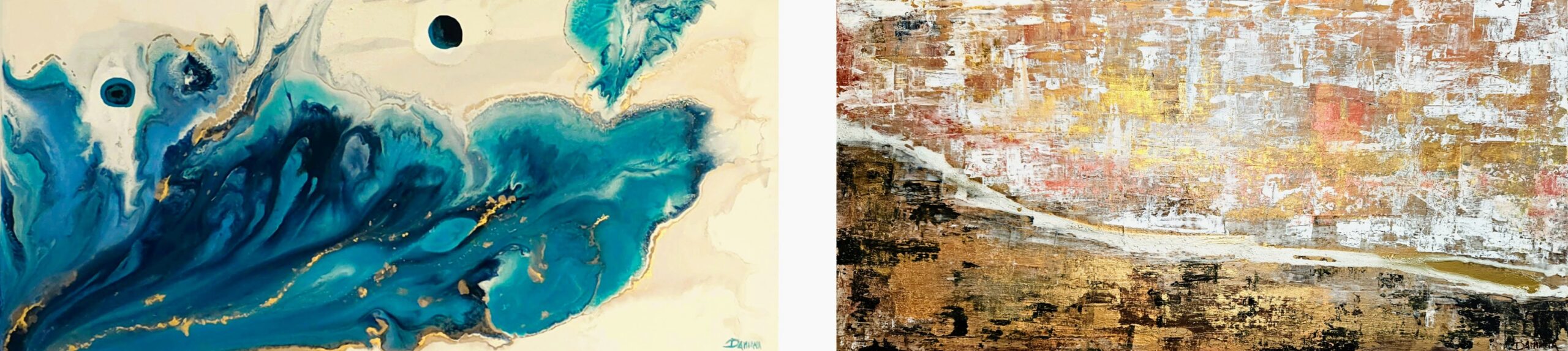 In "Burning Matter" il flusso diventa la forza primordiale di terra e fuoco, resa attraverso spatolate materiche e la brillantezza della polvere di mica, simbolo di energia e trasformazione.