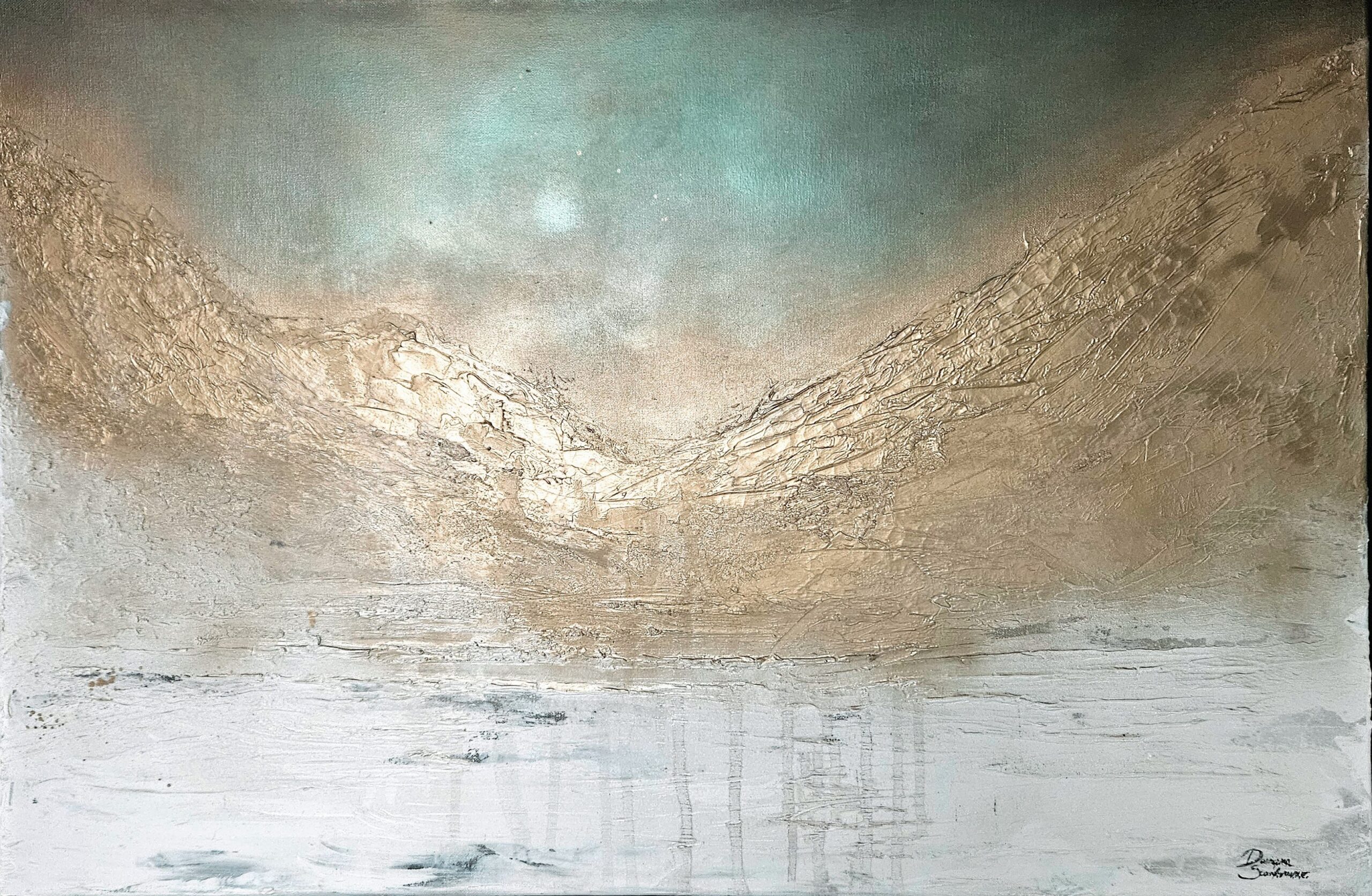 Protagonista è la luce, che si riflette sul bianco azzurrato della neve, sulle cime dorate dei monti, negli spazi immensi dai colori cangianti del cielo invernale. La polvere di mica si stende a creare sensazioni, più che impressioni nette, come la trama sottile di un sogno che cambia il proprio stato all'improvviso. La matericità delle montagne è resa con spatolate di gesso che forniscono una base materica e tattile in grado di creare, con chiaroscuri lucidi e opachi, gli anfratti nei quali una polvere brillante e iridescente si adagia.